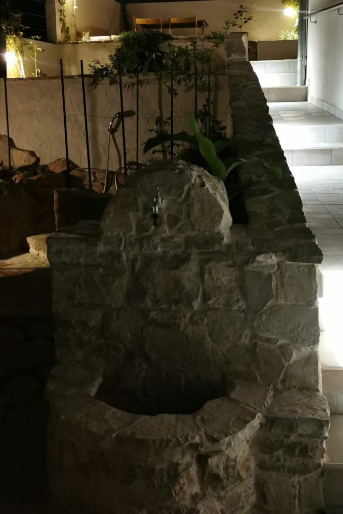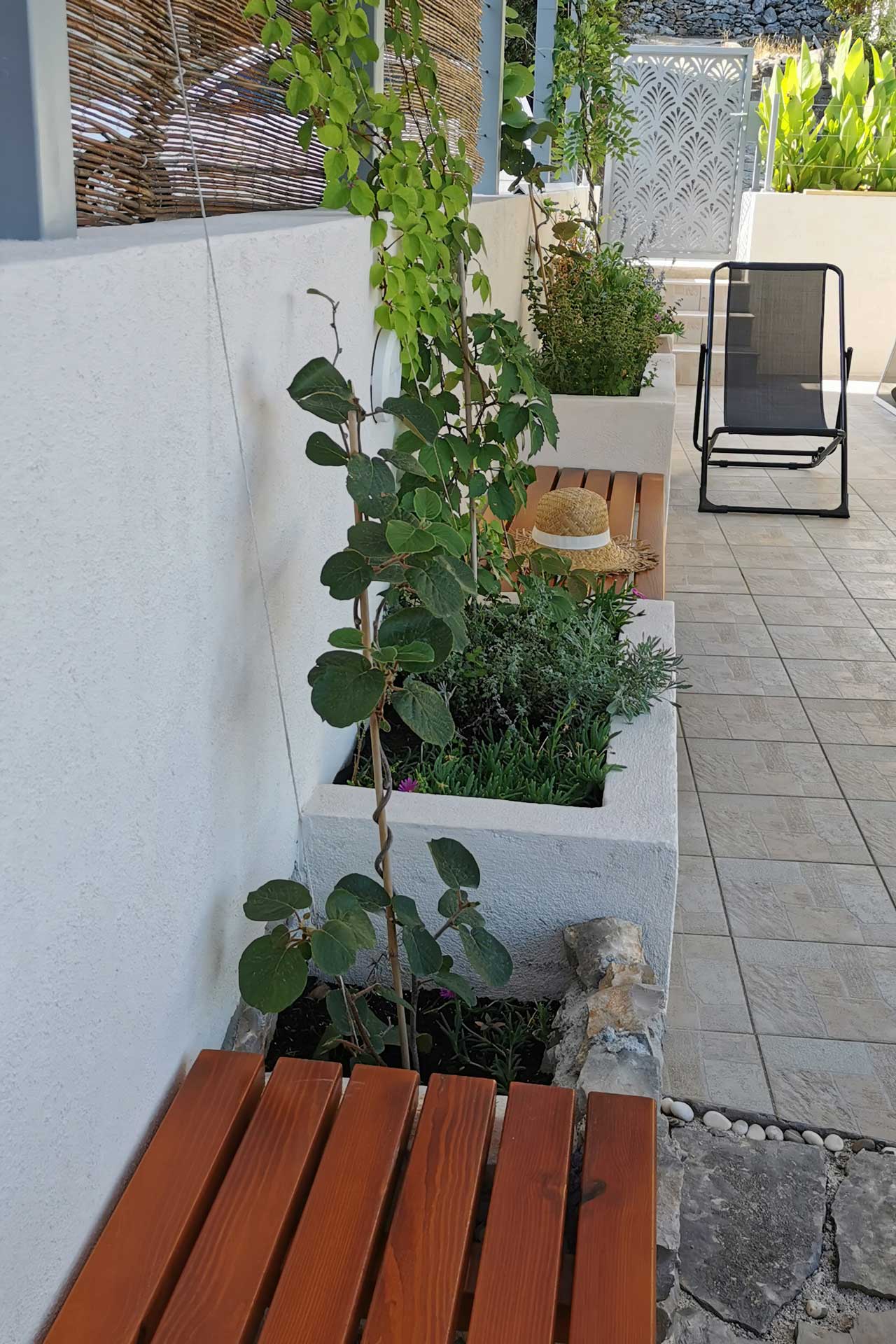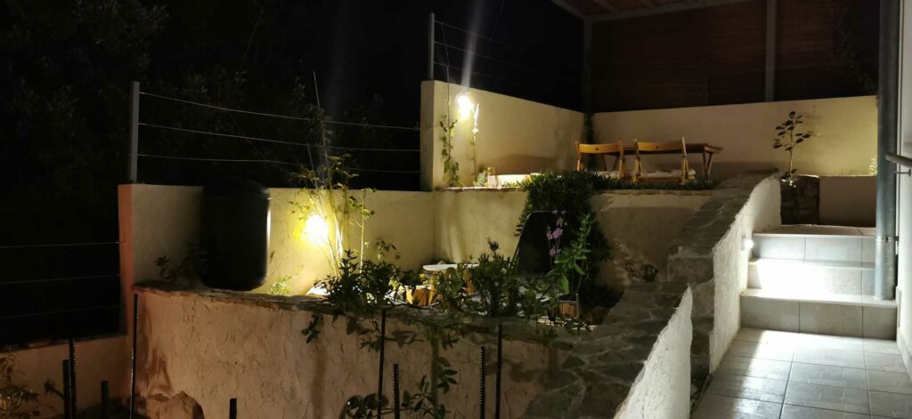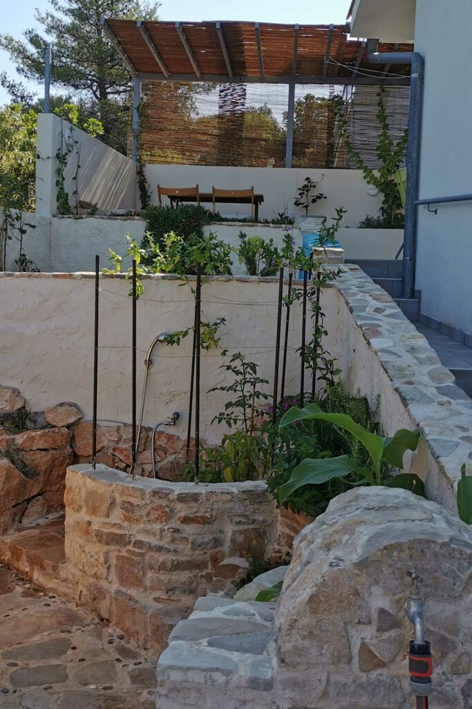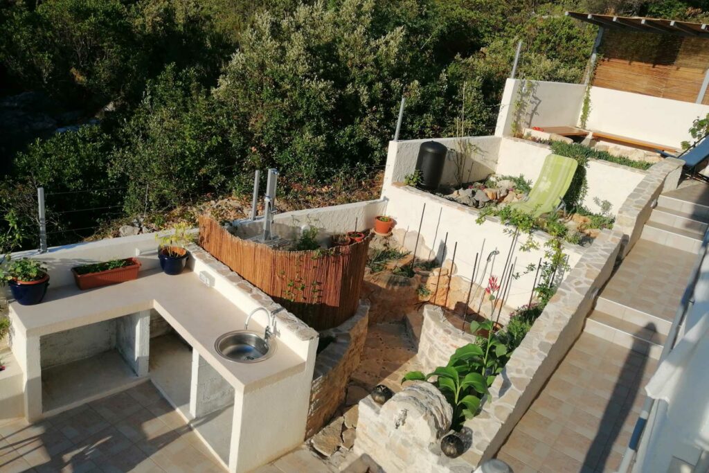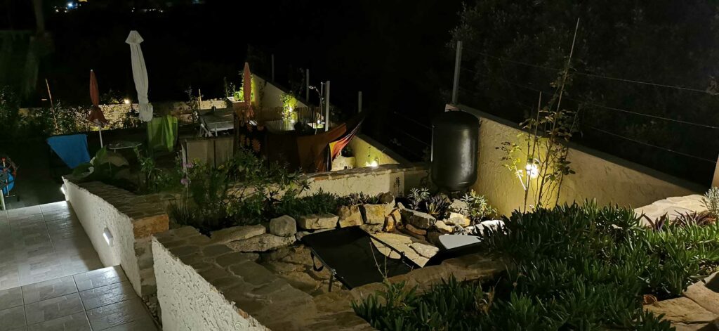 Bei der Umgestaltung des Außenraums wurde mit der bestehenden Bausubstanz gearbeitet. Damit wurden die vorhandenen Wände optimal in die Gestaltung integriert, die Kosten dadurch niedrig gehalten und durch erweiterte Eingriffe neue Bereiche geschaffen. Durch die terrassenförmige Anordnung ergibt sich tagsüber ein wunderschöner Ausblick auf das Meer und abends auf unglaubliche Sonnenuntergänge. Diese können beim morgentlichen Kaffee auf der obersten Terasse, beim Sonnen auf der mittleren Terasse oder beim Kochen und Duschen von der großen untersten Terasse genossen werden. Somit bildet jeder Bereich ein eigenes Thema, welches durch die Materialität, Farben, Strukturen, Formen, Pflanzen und Beleuchtung geschaffen wird. Die natürlichen Farben des lokalen Steines in Kombination mit den restlichen Materialien und Farben harmonieren perfekt mit der bestehende Bausubstanz und der Umgebung.
