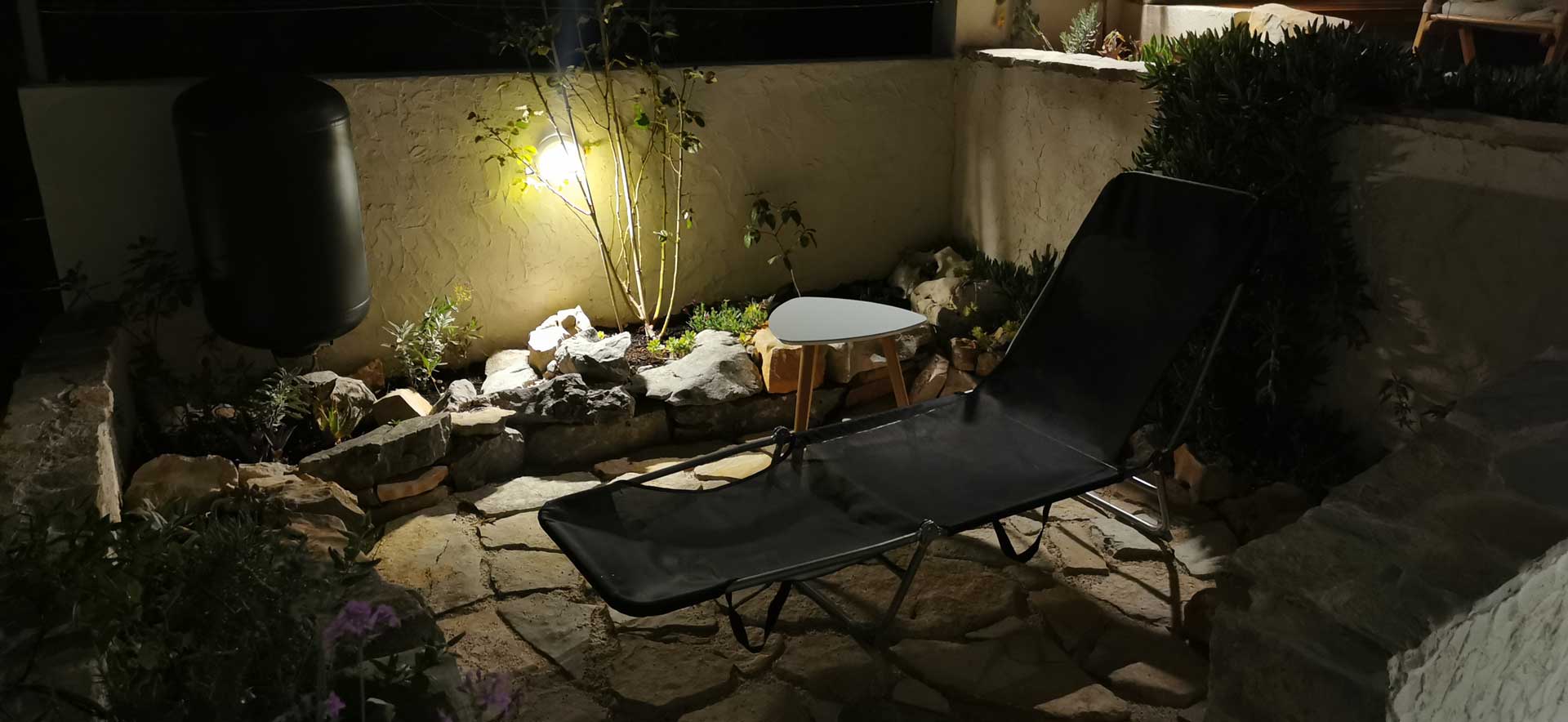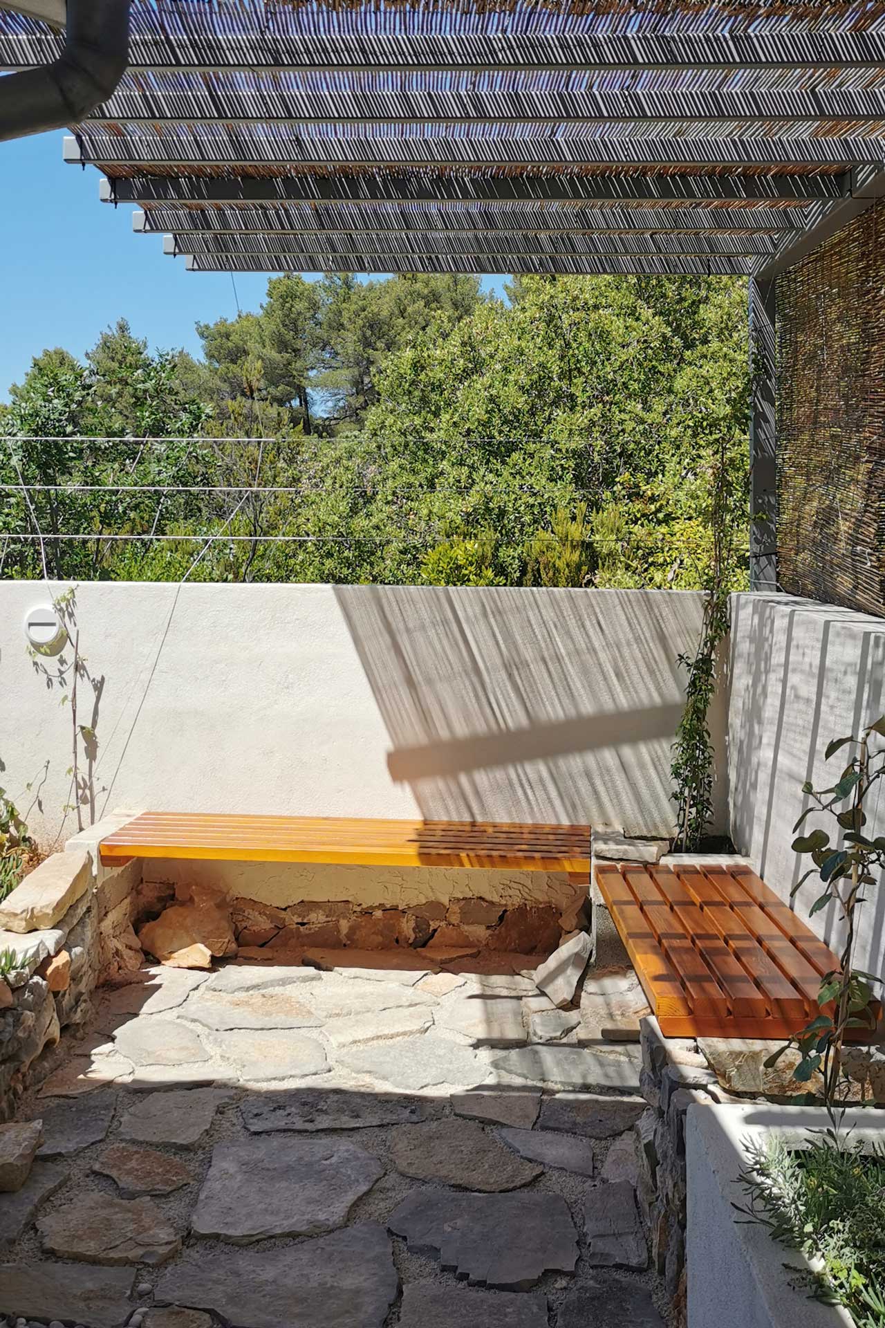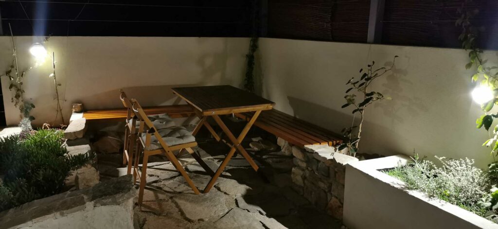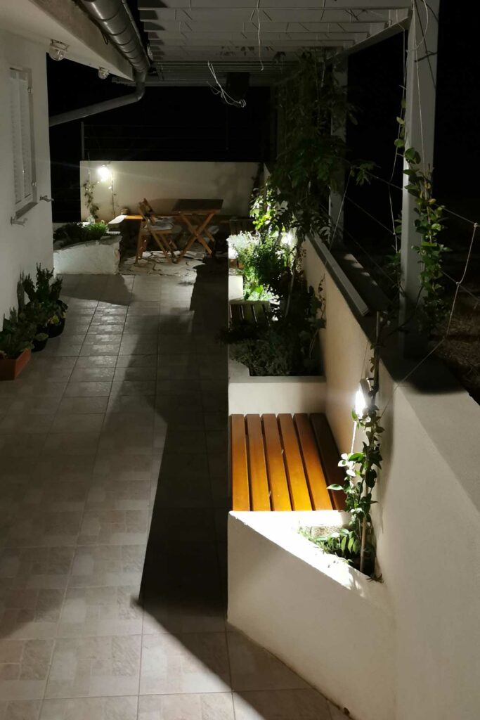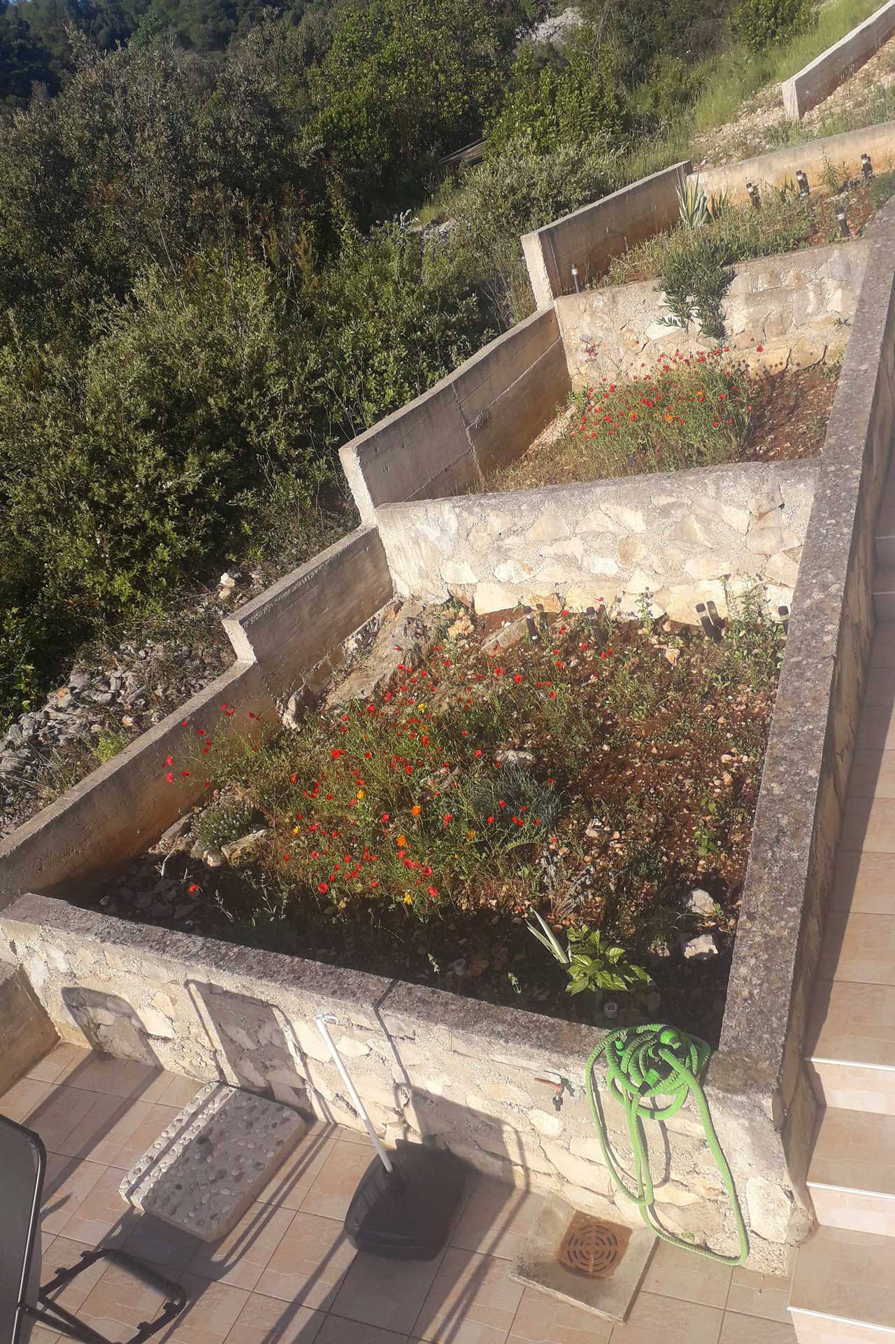 Bei der Umgestaltung des Außenraums wurde mit der bestehenden Bausubstanz gearbeitet. Damit wurden die vorhandenen Wände optimal in die Gestaltung integriert, die Kosten dadurch niedrig gehalten und durch erweiterte Eingriffe neue Bereiche geschaffen. Durch die terrassenförmige Anordnung ergibt sich tagsüber ein wunderschöner Ausblick auf das Meer und abends auf unglaubliche Sonnenuntergänge. Diese können beim morgentlichen Kaffee auf der obersten Terasse, beim Sonnen auf der mittleren Terasse oder beim Kochen und Duschen von der großen untersten Terasse genossen werden. Somit bildet jeder Bereich ein eigenes Thema, welches durch die Materialität, Farben, Strukturen, Formen, Pflanzen und Beleuchtung geschaffen wird. Die natürlichen Farben des lokalen Steines in Kombination mit den restlichen Materialien und Farben harmonieren perfekt mit der bestehende Bausubstanz und der Umgebung.