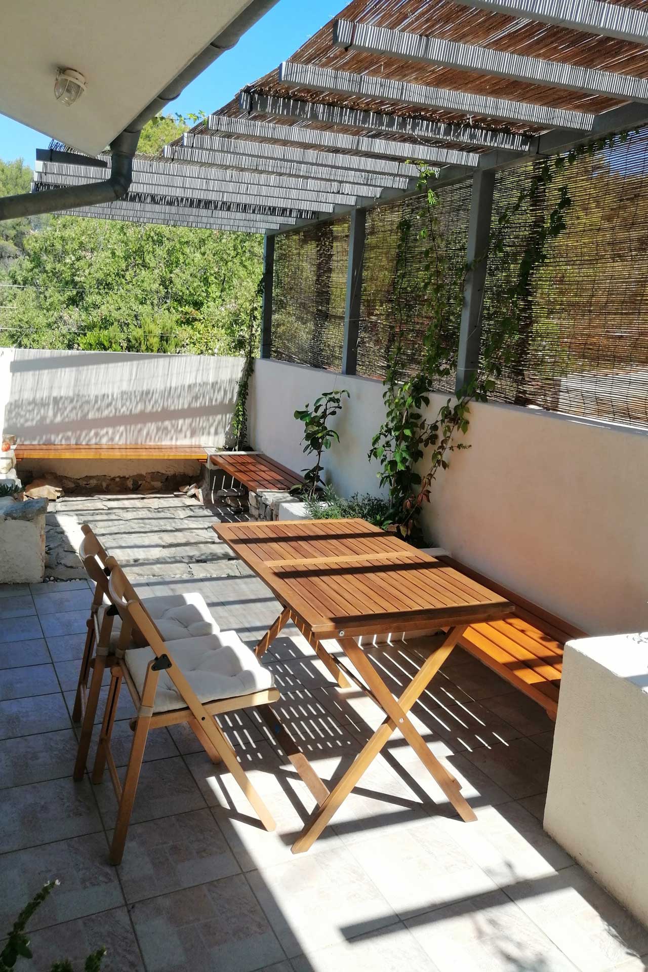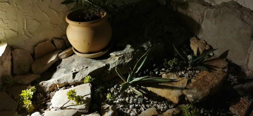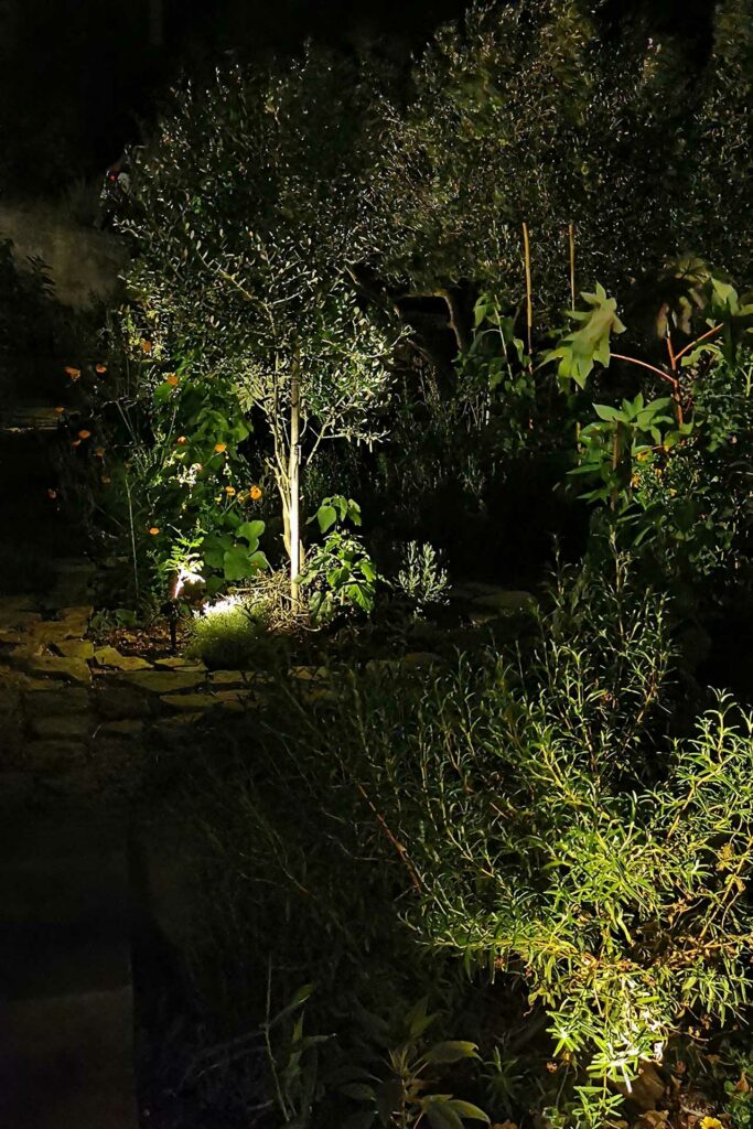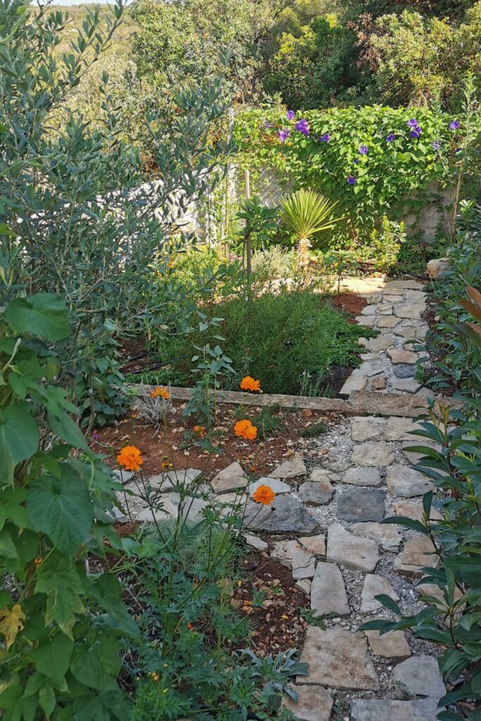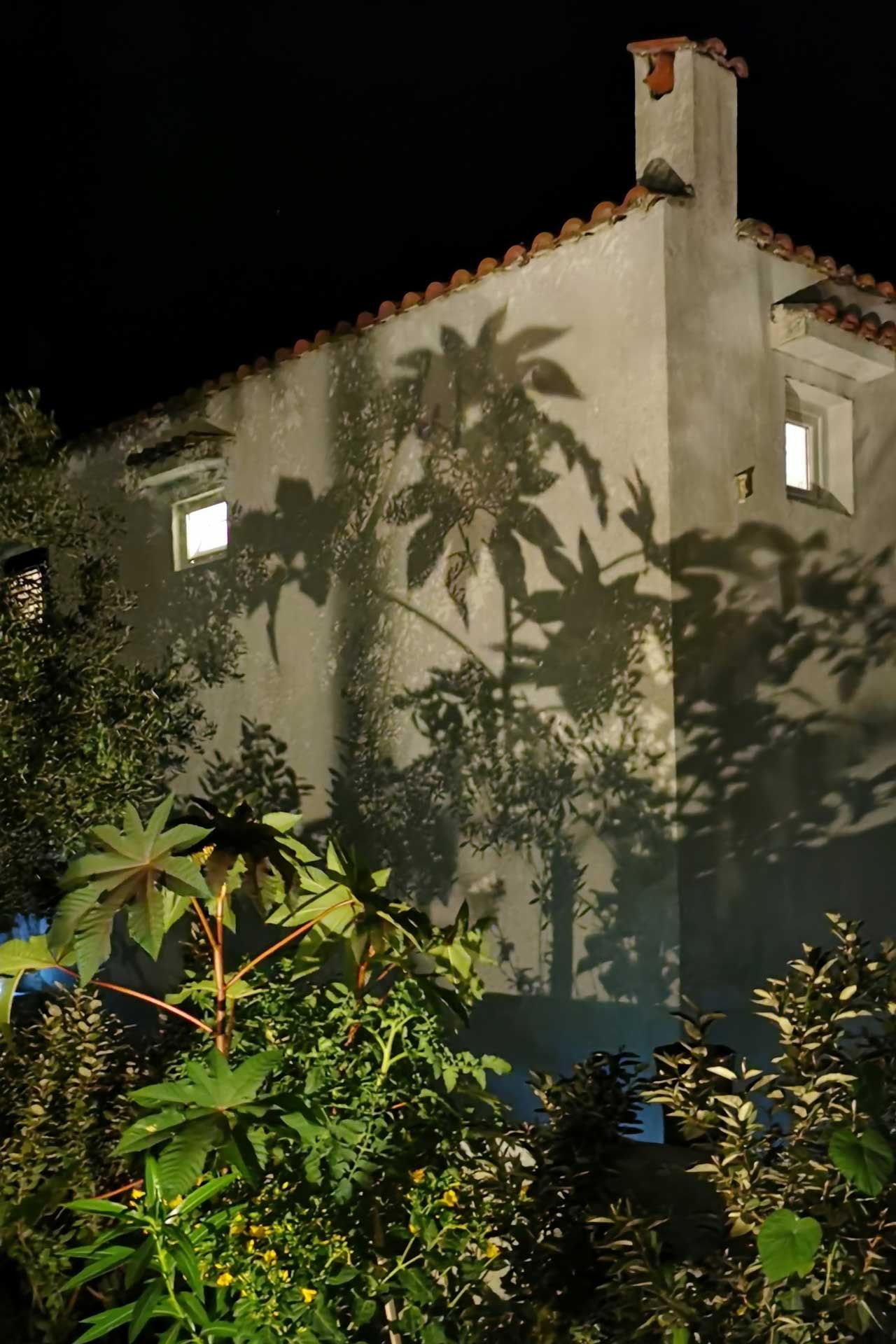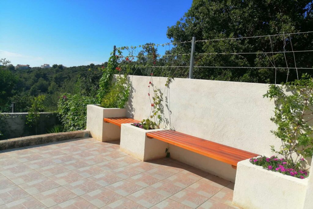 Bei der Umgestaltung des Außenraums wurde mit der bestehenden Bausubstanz gearbeitet. Damit wurden die vorhandenen Wände optimal in die Gestaltung integriert, die Kosten dadurch niedrig gehalten und durch erweiterte Eingriffe neue Bereiche geschaffen. Durch die terrassenförmige Anordnung ergibt sich tagsüber ein wunderschöner Ausblick auf das Meer und abends auf unglaubliche Sonnenuntergänge. Diese können beim morgentlichen Kaffee auf der obersten Terasse, beim Sonnen auf der mittleren Terasse oder beim Kochen und Duschen von der großen untersten Terasse genossen werden. Somit bildet jeder Bereich ein eigenes Thema, welches durch die Materialität, Farben, Strukturen, Formen, Pflanzen und Beleuchtung geschaffen wird. Die natürlichen Farben des lokalen Steines in Kombination mit den restlichen Materialien und Farben harmonieren perfekt mit der bestehende Bausubstanz und der Umgebung.
