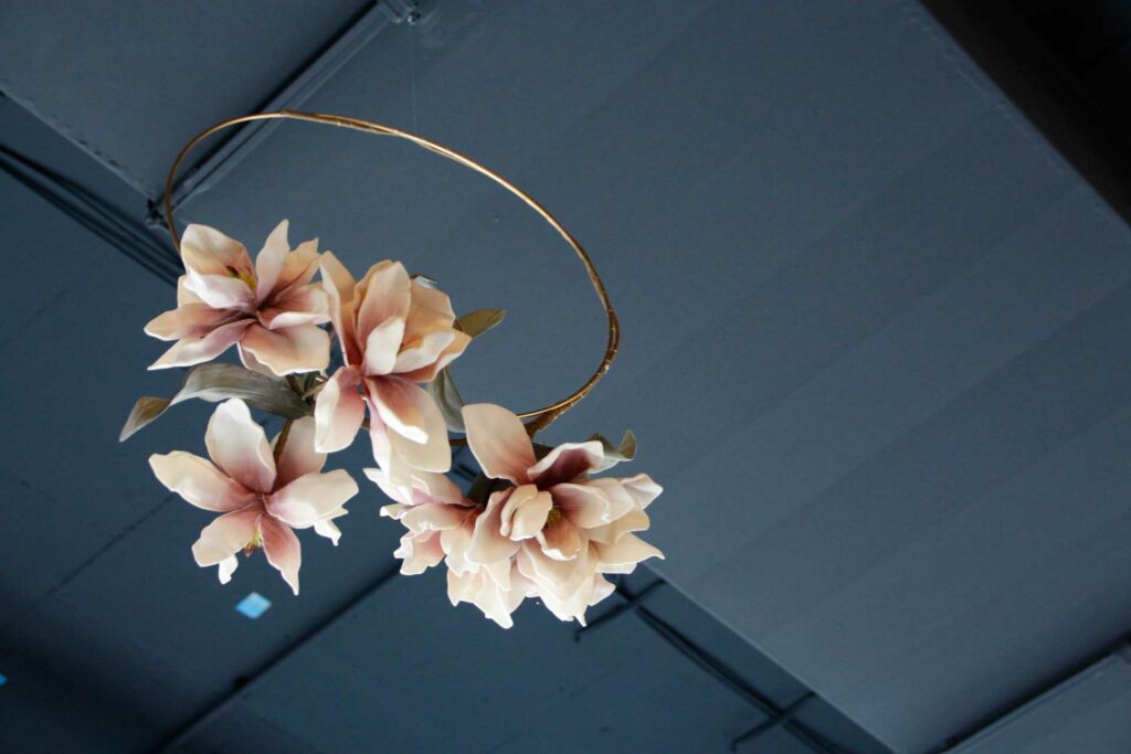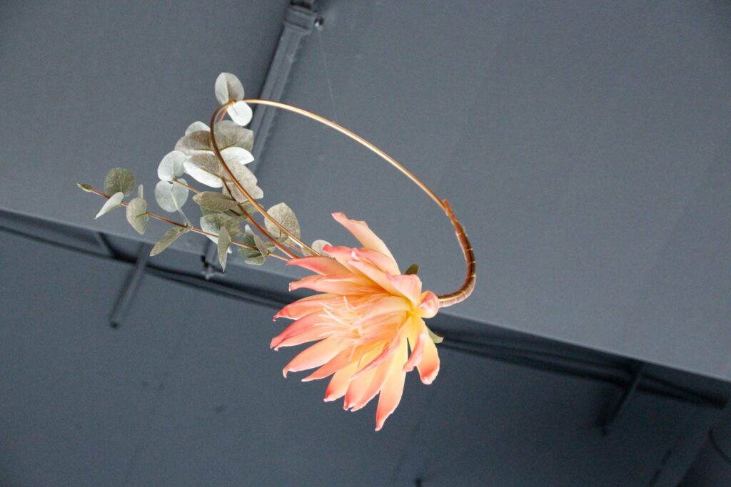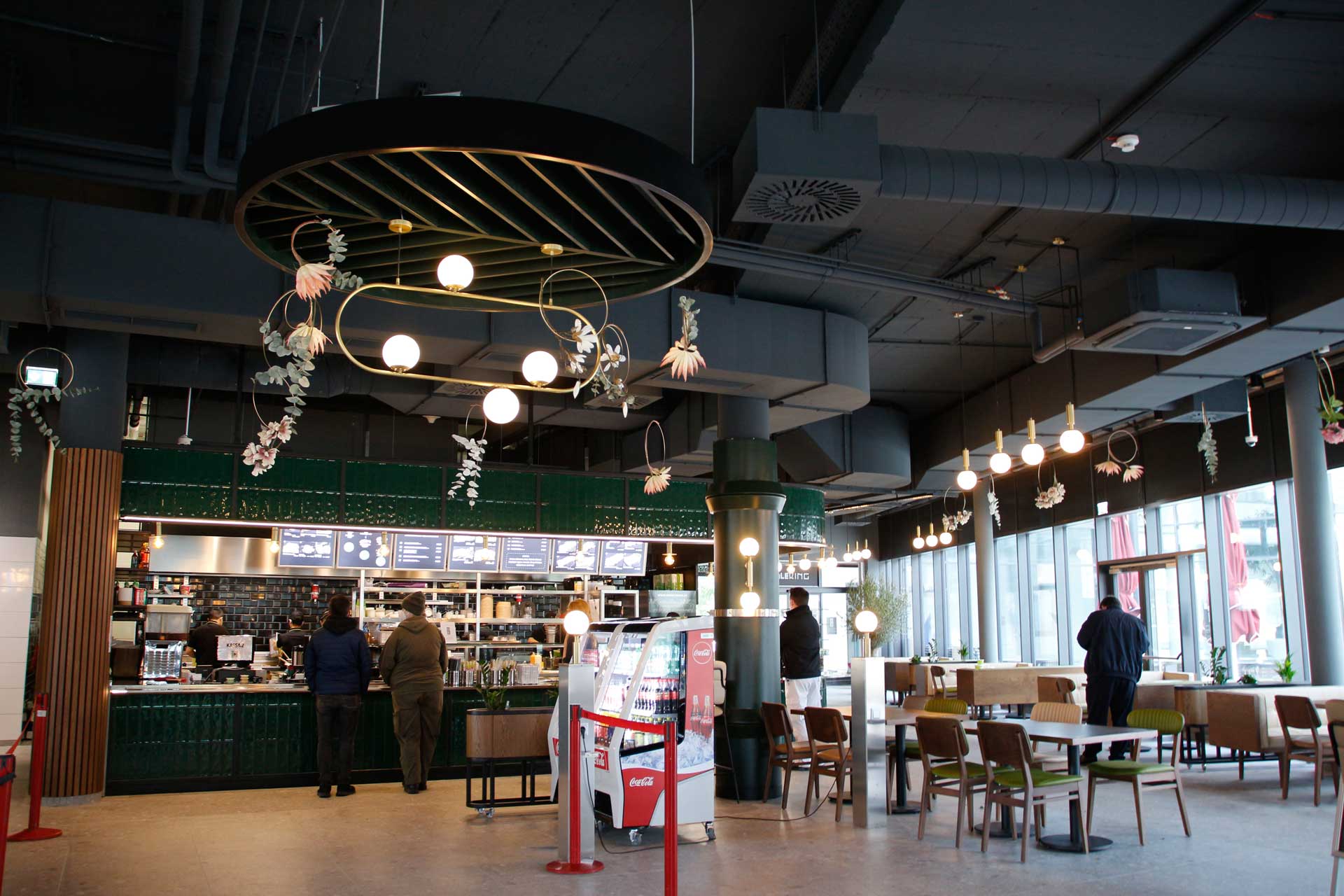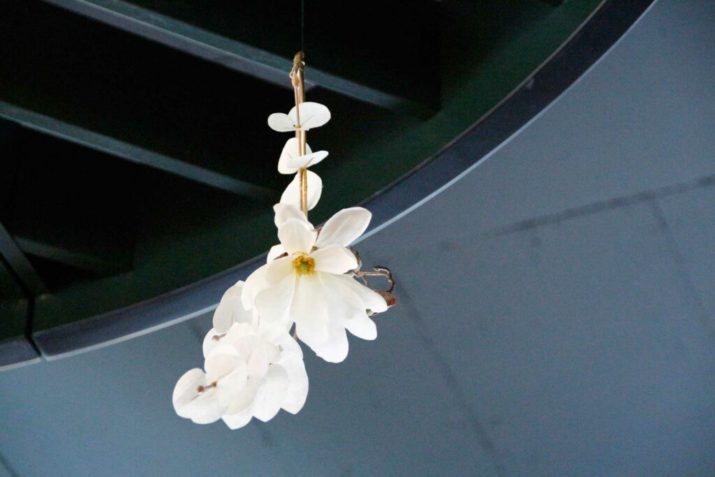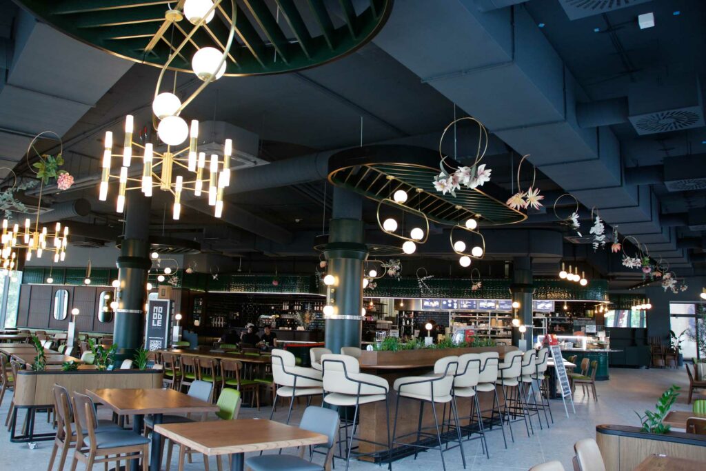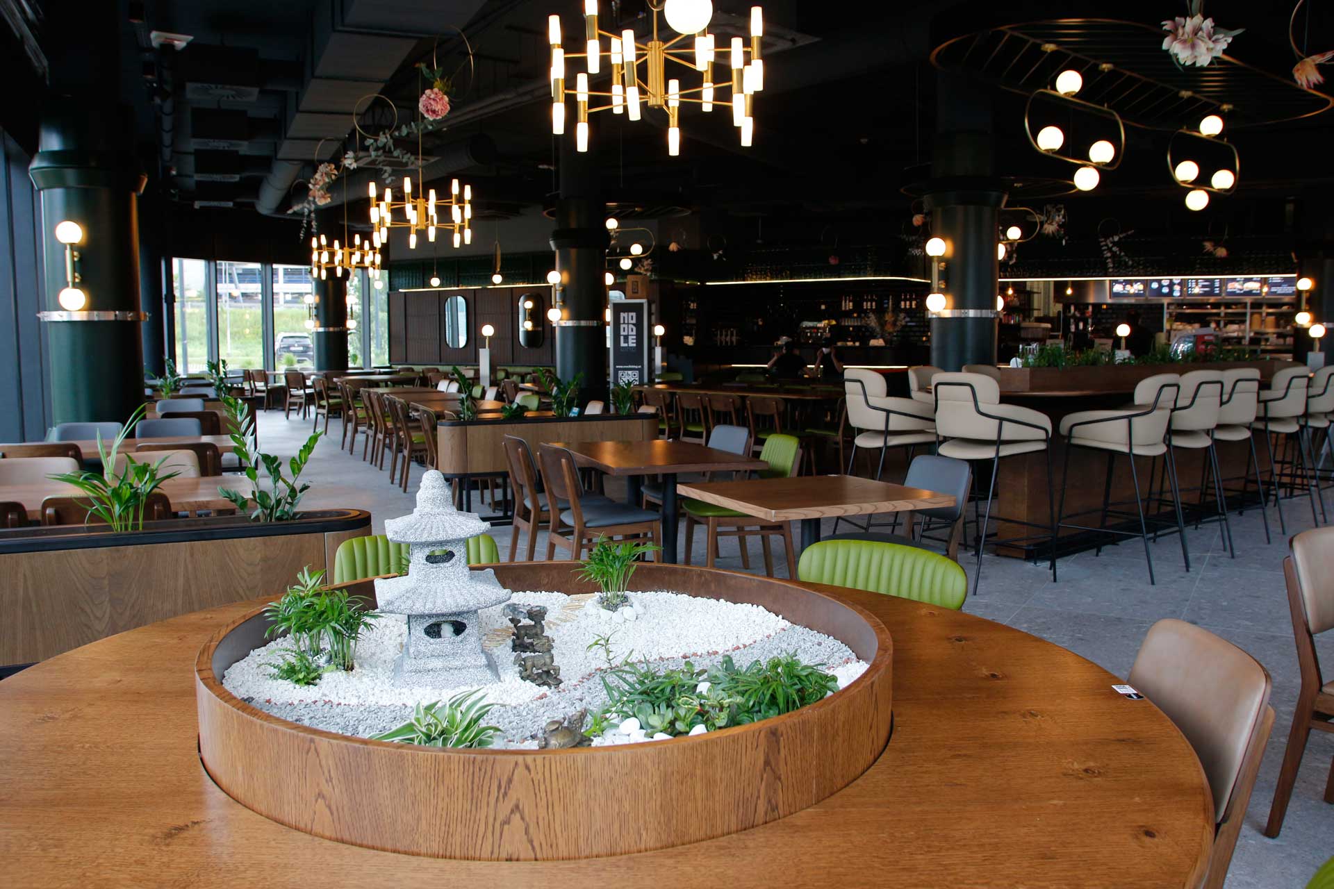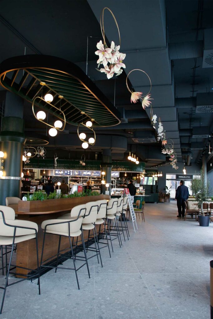 Bei der Gestaltung des Innenraums wurden gezielte Akzente durch Pflanzen und Gestaltungselemente gesetzt. Die Farben und Formen der Möbel, Beleuchtung und Gestaltungselemente harmonieren miteinander und schaffen eine Wohlfühlatmosphäre im Restaurant. Die unterschiedlichen Blumen entlang der Decke kreieren zusätzliche Farbakzente neben den Grün-, Beige- und Messingtönen und schaffen damit ein lebendiges Ambiente des Innenraums.