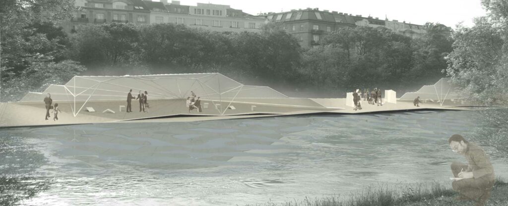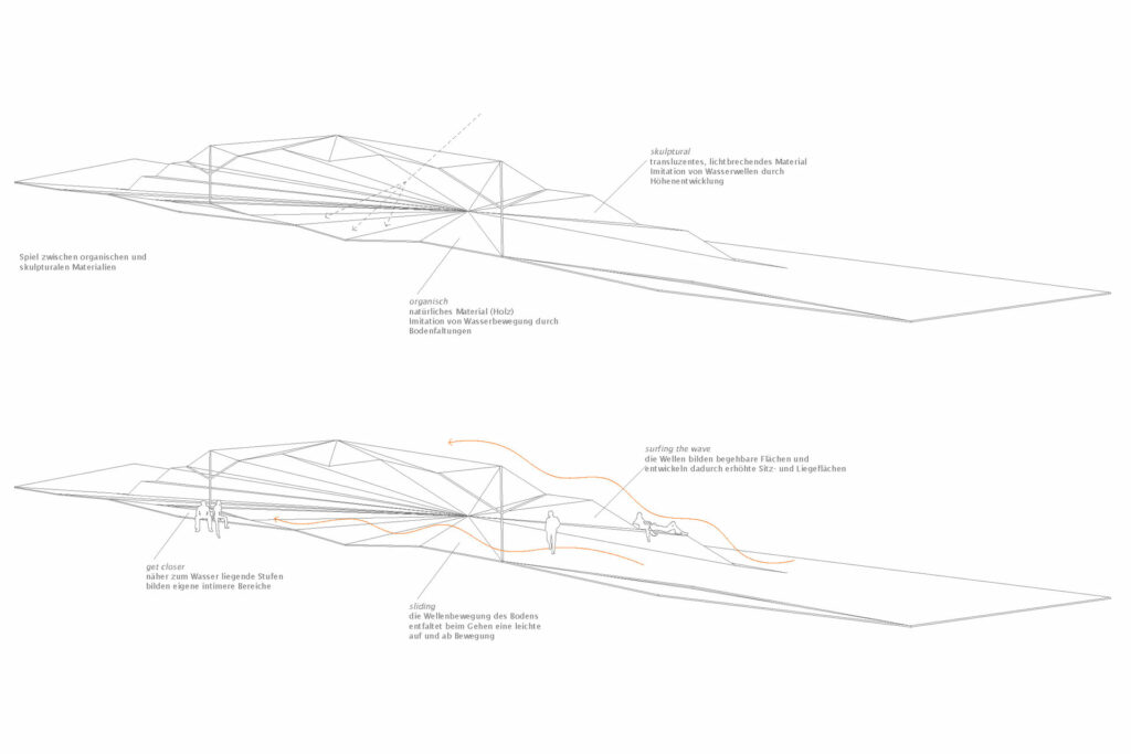 Eine schwimmende Landschaft, inspiriert durch Wellenbewegungen, bildet einen öffentlichen Treffpunkt am Donaukanal beim Kunsthaus Wien. Unterschiedliche Objekte wie Sitz- und Liegebereiche, Paneele, Verschattungs- und Leuchtelemente und diverse Staumöglichkeiten klappen aus dem Boden heraus und bieten damit unterschiedliche Nutzungen an. Die Wellen bilden einen halboffenen Raum, der für verschiedene Veranstaltungen genutzt werden kann. Von Messen, Tanzveranstaltungen bis hin zum einfachen Verweilen lädt dieser öffentliche Ort am Donaukanal ein.