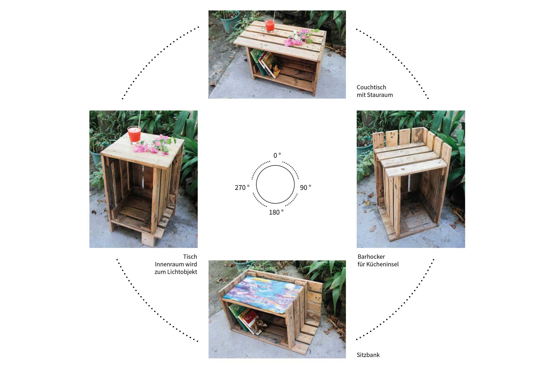 Alten Holzpaletten wurde ein neuer ökologischer Look verpasst. Die Multifunktionalität in nur einem Objekt, bietet für kleine Wohnungen vier unterschiedliche Nutzungen an. Da freut sich nicht nur die Umwelt, sondern man wohnt damit nachhaltig, platzsparend und smart. Am Abend wird der Innenraum des Möbels zum Lichtobjekt.